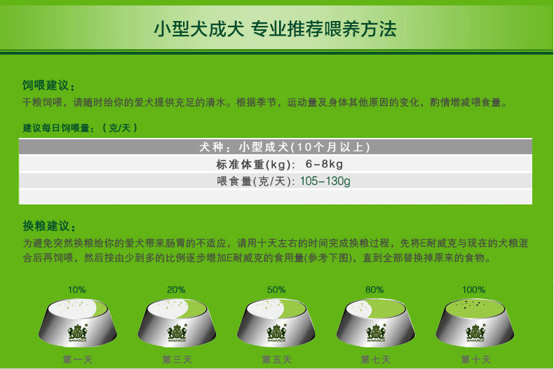 干糧飼喂,請隨時給您的愛犬提供充足的清水。根據季節、運動量及身體其他原因的變化,酌情增減喂食量。